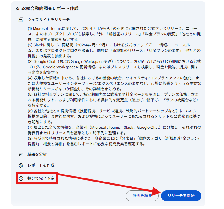 プロンプトを入力するだけで、AIが計画を立て、情報を集め、わずか数分で引用元付きのレポートを生成してくれるのは本当に便利ですよね!