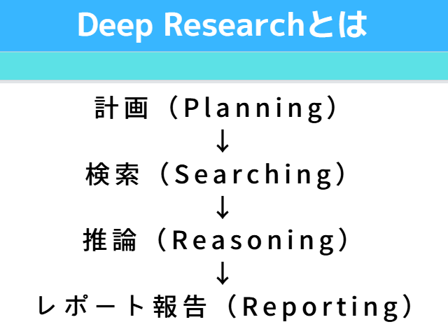 ユーザーのプロンプトに応じ、どのようにリサーチを行うのか計画→検索→推論→レポート報告というプロセスをAIが自律的に実行します。