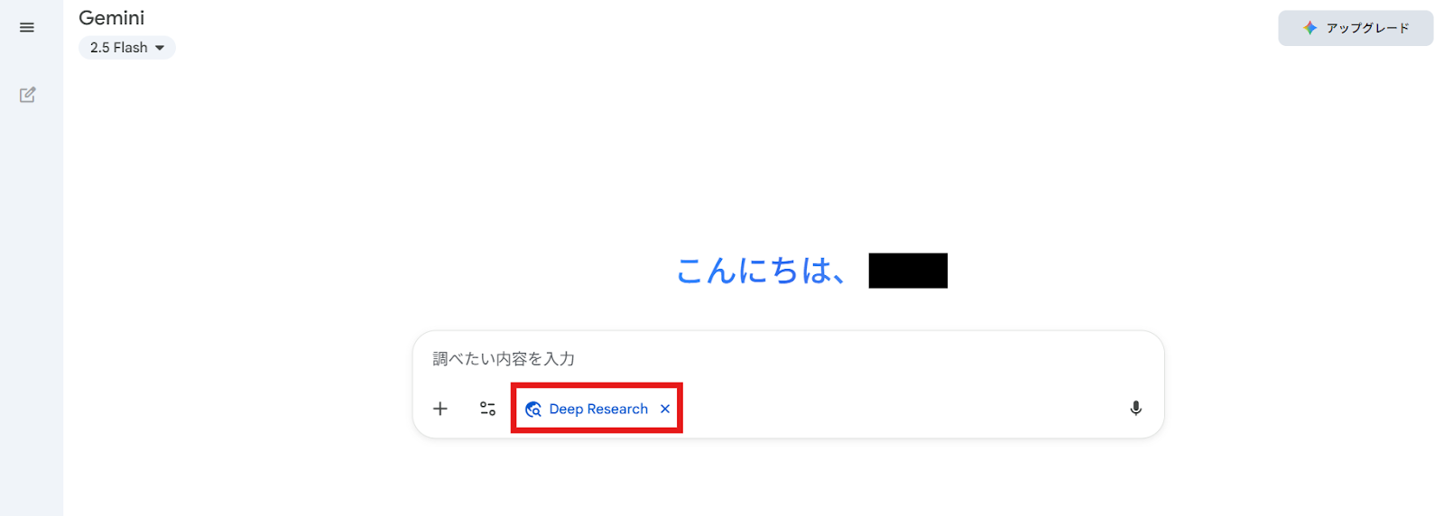 Googleアカウントにログインし、Geminiの画面を開きます。入力欄付近やツールメニューにある「Deep Research」をクリックしてモードを切り替えます。