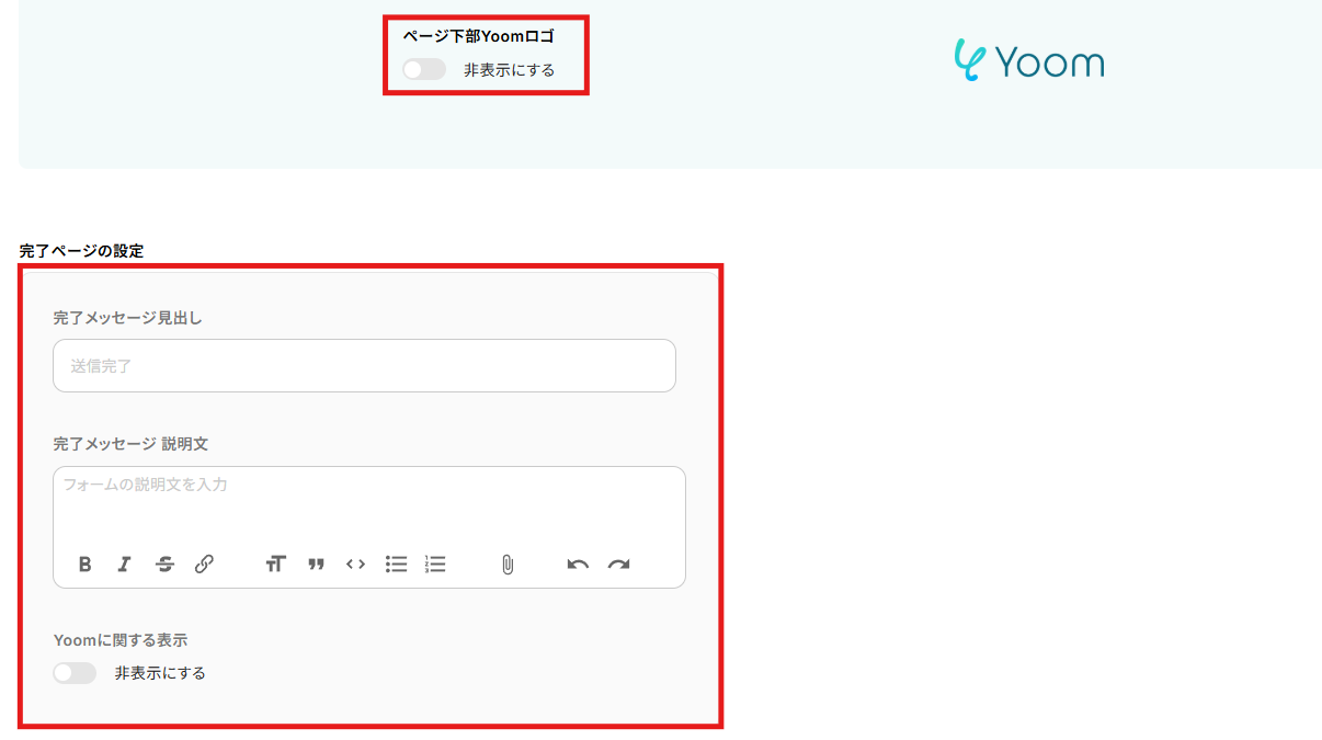 3.フォームページの下部に表示されるYoomロゴを非表示にできます。 フォームの回答完了後に表示されるメッセージなども編集可能です。