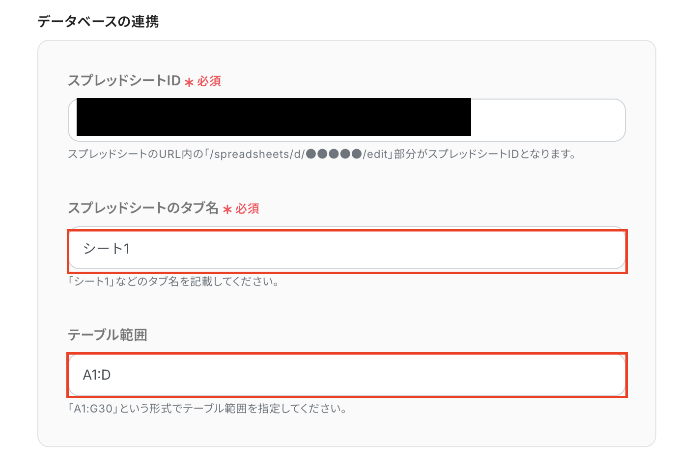 スプレッドシートのタブ名とテーブル範囲を設定し、次へをクリックしてください。