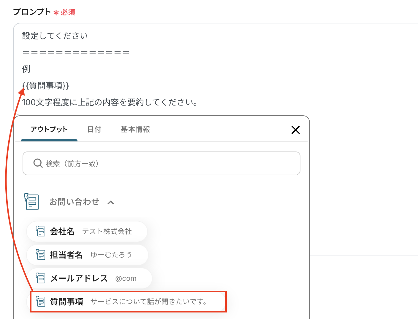 プロンプトには要約したい文章を設定したいので、フォームトリガーで取得した「質問事項」をアウトプットから選択します。 アウトプットを設定すると変動する値が{{●●}}のように表示されます。 アウトプットを活用せず、文章を入力すると同じ内容を繰り返し要約することになりますので、注意してください! アウトプットについてはこちら を参考にしてください。