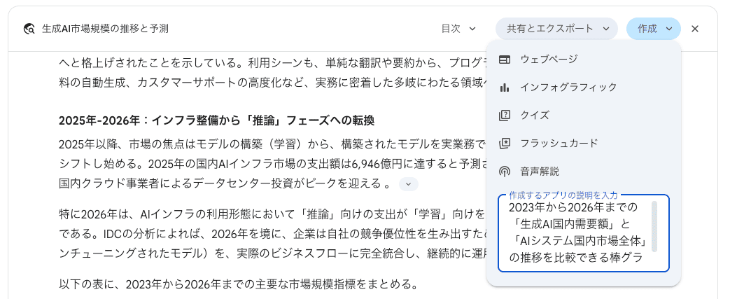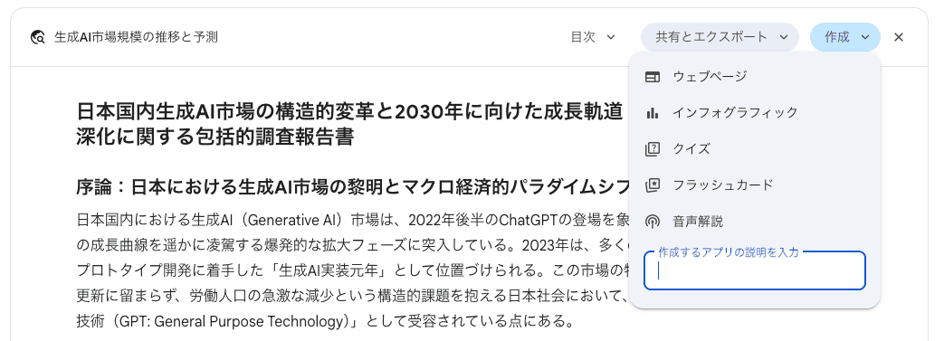 Geminiに特定のテーマを深くリサーチさせた後、結果画面の「作成」ボタンから「インフォグラフィック」を選択すると、リサーチで得られた膨大なデータが1枚の視覚的な図解として出力されます。