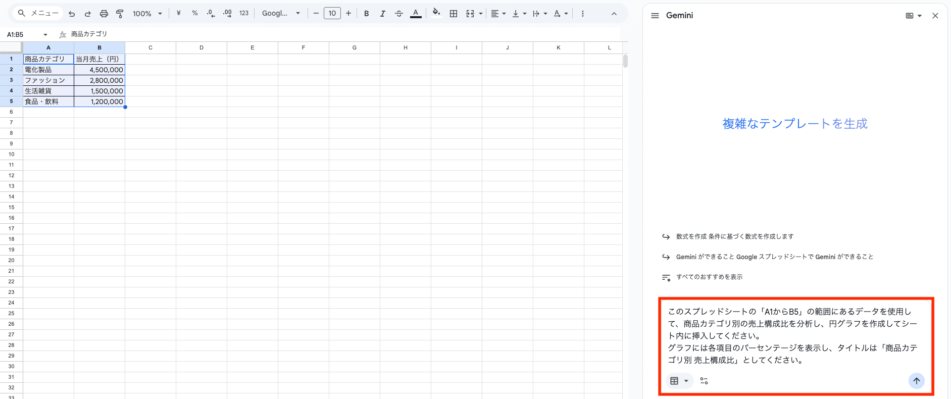 スプレッドシートの「A1からB5」の範囲にあるデータを使用して、商品カテゴリ別の売上構成比を分析し、円グラフを作成してください。