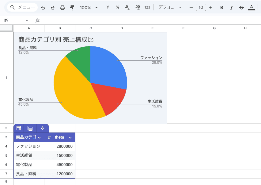 指示した範囲を認識し、完璧な比率の円グラフがシート内に生成されました。グラフには指定通りのパーセンテージが付与され、タイトルも反映されています。
