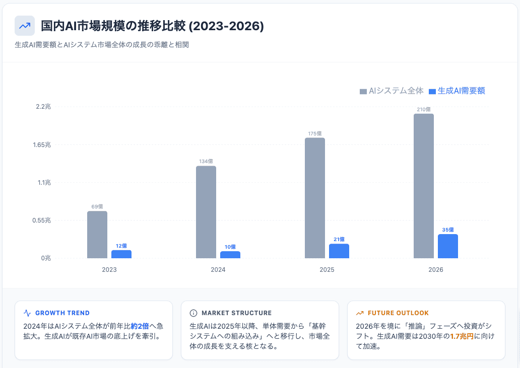日本国内の生成AI市場規模について、2023年から2026年までの実績推移と、2030年までの将来予測を詳細に調査してください。