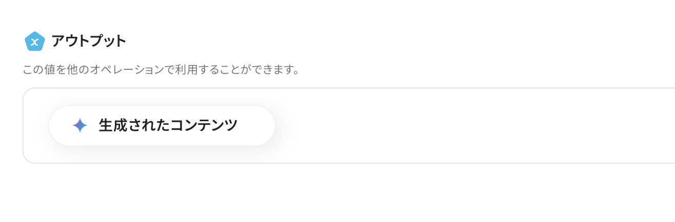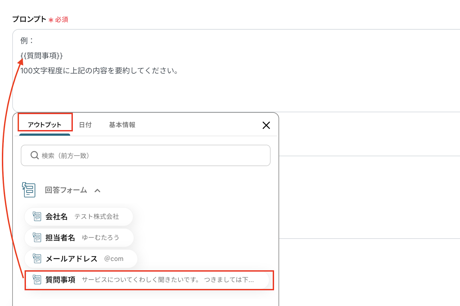 プロンプトは、指示文章を作成し、フォームトリガーで取得した「質問事項」をアウトプットから選択します。 アウトプットを使うことで、都度手動で値を設定する必要がなくなります。 アウトプットを使用しなかった場合、同じ内容が繰り返し要約されるため、必ずアウトプットを活用しましょう。 アウトプットについてはこちら を参考にしましょう。