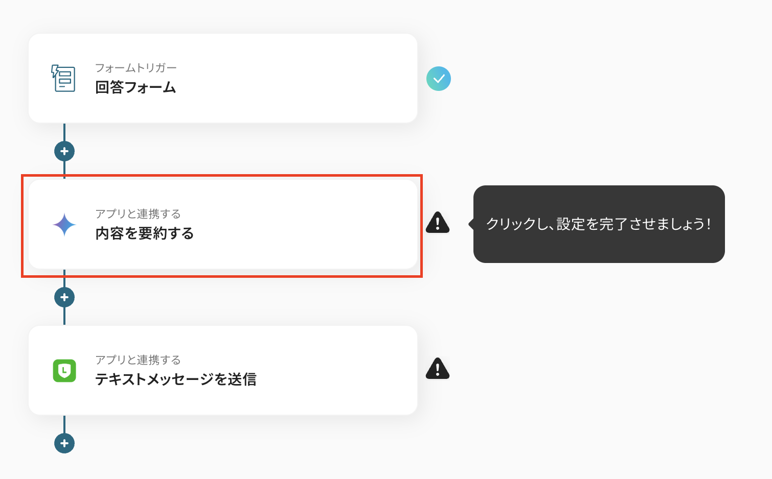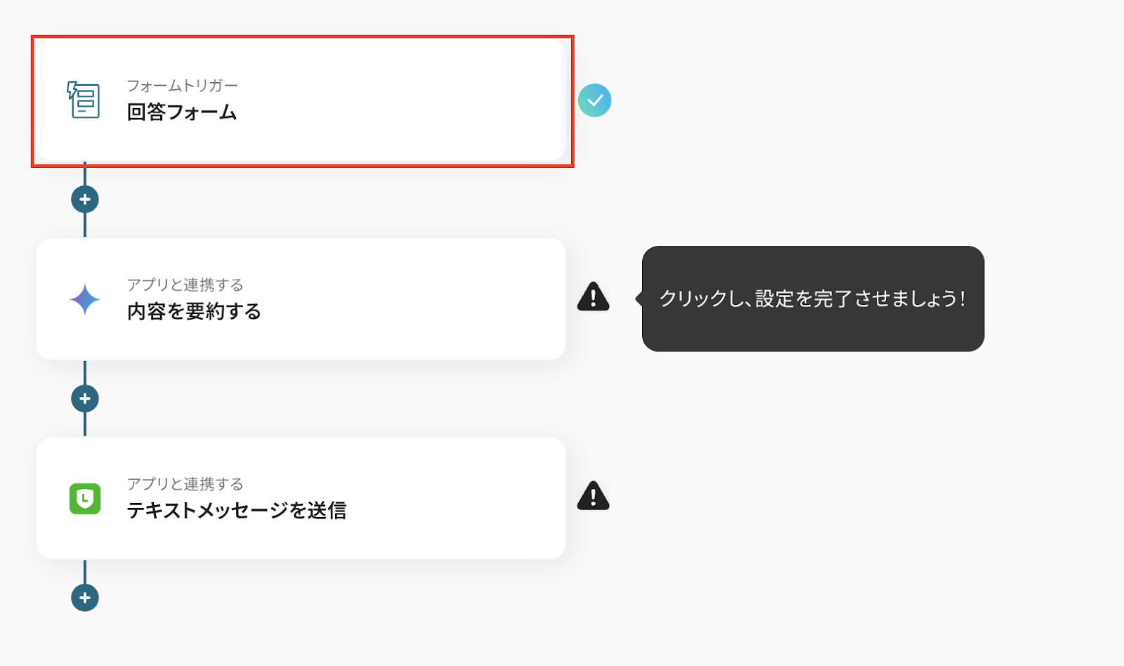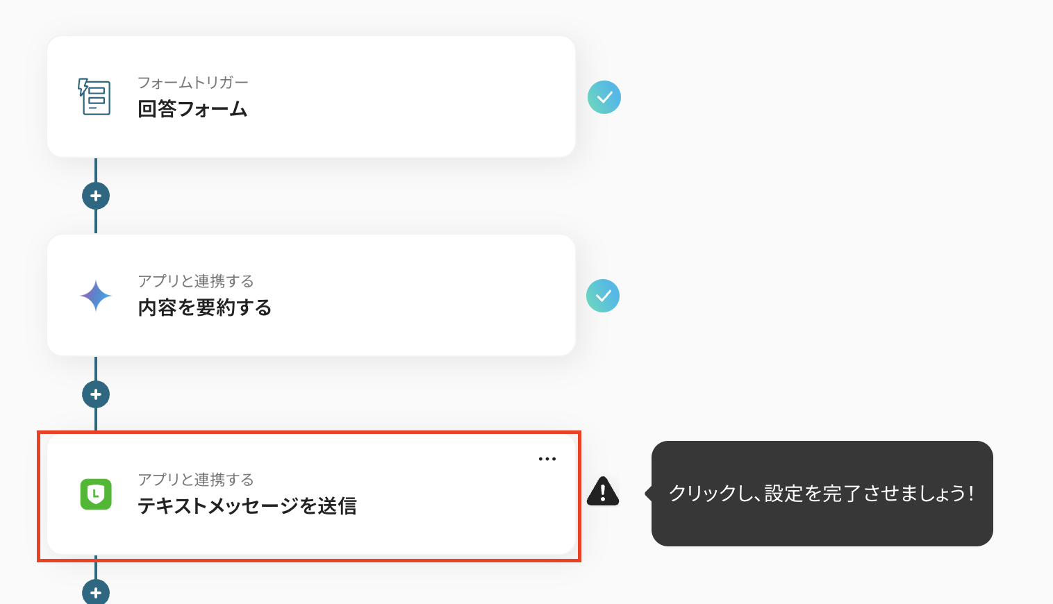 ステップ5:LINE公式アカウントのアクションを設定しよう 最後の設定ステップです。 「テキストメッセージを送信」をクリックしましょう。