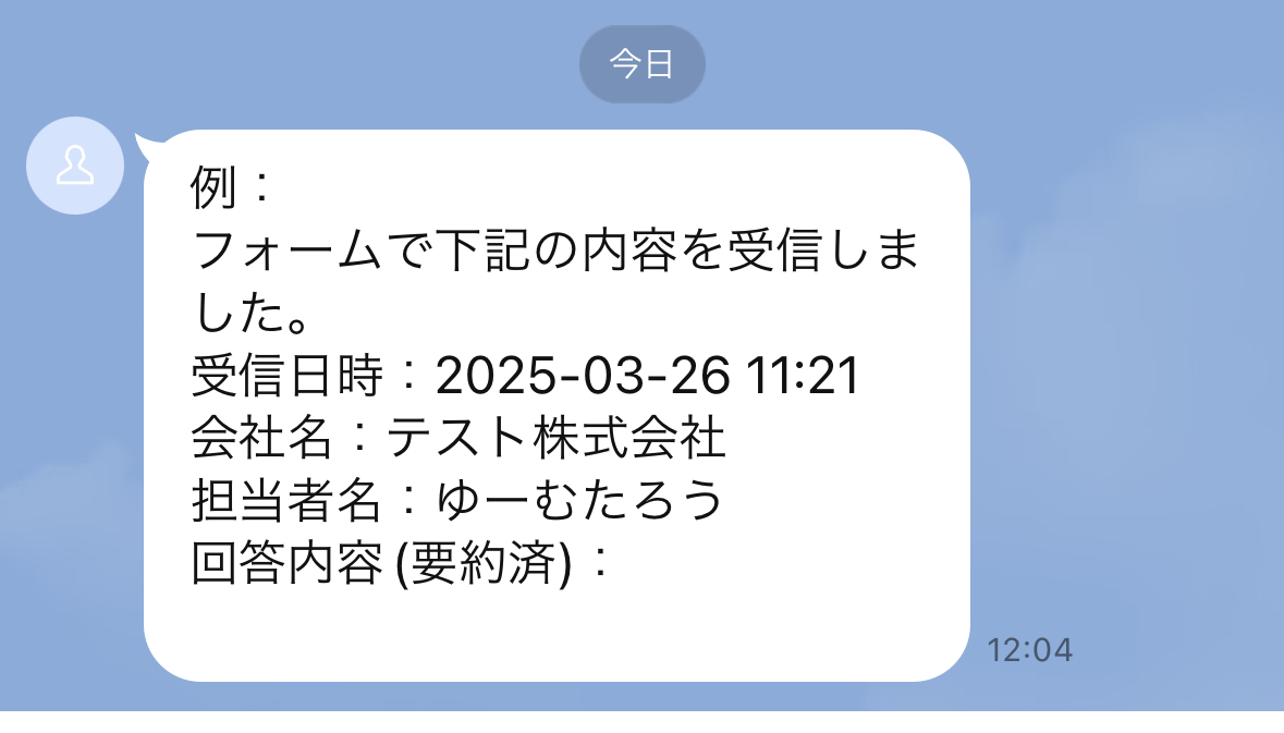 フォームからの問い合わせやアンケート回答の確認に時間を要しているご担当者の方 Geminiを活用して、テキスト情報の要約作業を自動化したいと考えている方 重要な通知をLINE公式アカウントで受け取り、迅速な情報共有を実現したい方 ■このテンプレートを使うメリット