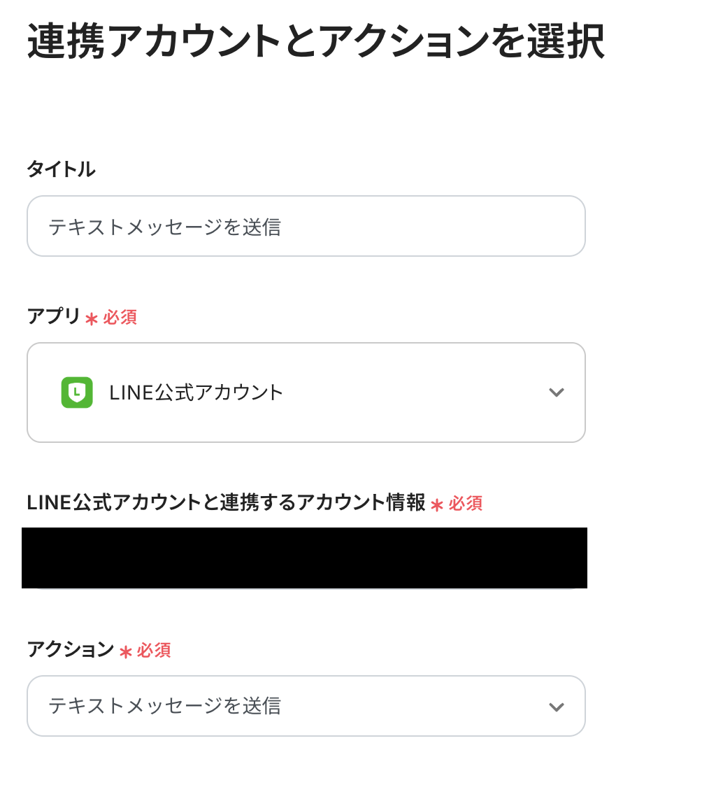連携アカウントとアクションを選択 タイトルは変更することができます。 LINE公式アカウントと連携するアカウント情報を確認しましょう。 アクションは「テキストメッセージを送信」が選択されていることを確認し、次へをクリックします。