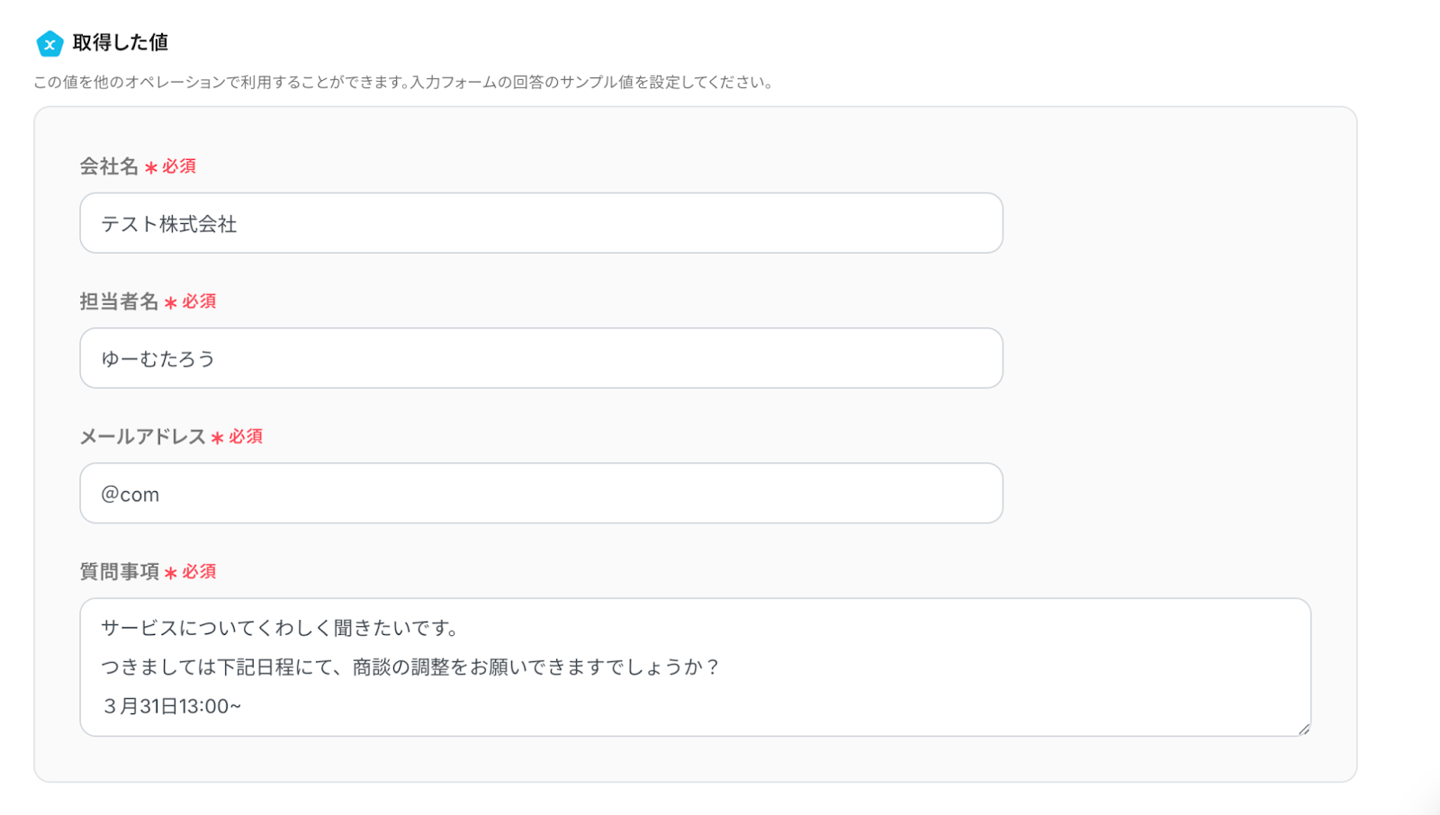 フォームの表示確認と詳細設定 取得した値にサンプル値を設定しましょう。 設定した値は、次のアクション時に使用します。 設定できたら、保存しましょう。