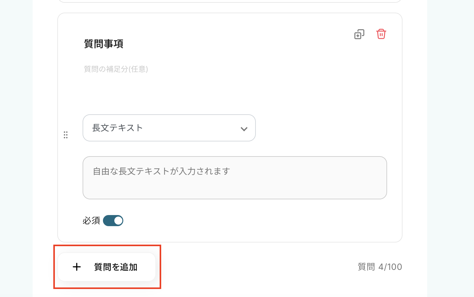 フォームを作成 回答フォームを作成しましょう。 質問項目を増やしたい時は、「質問を追加」をクリックしましょう。 設定したら、次へをクリックします。
