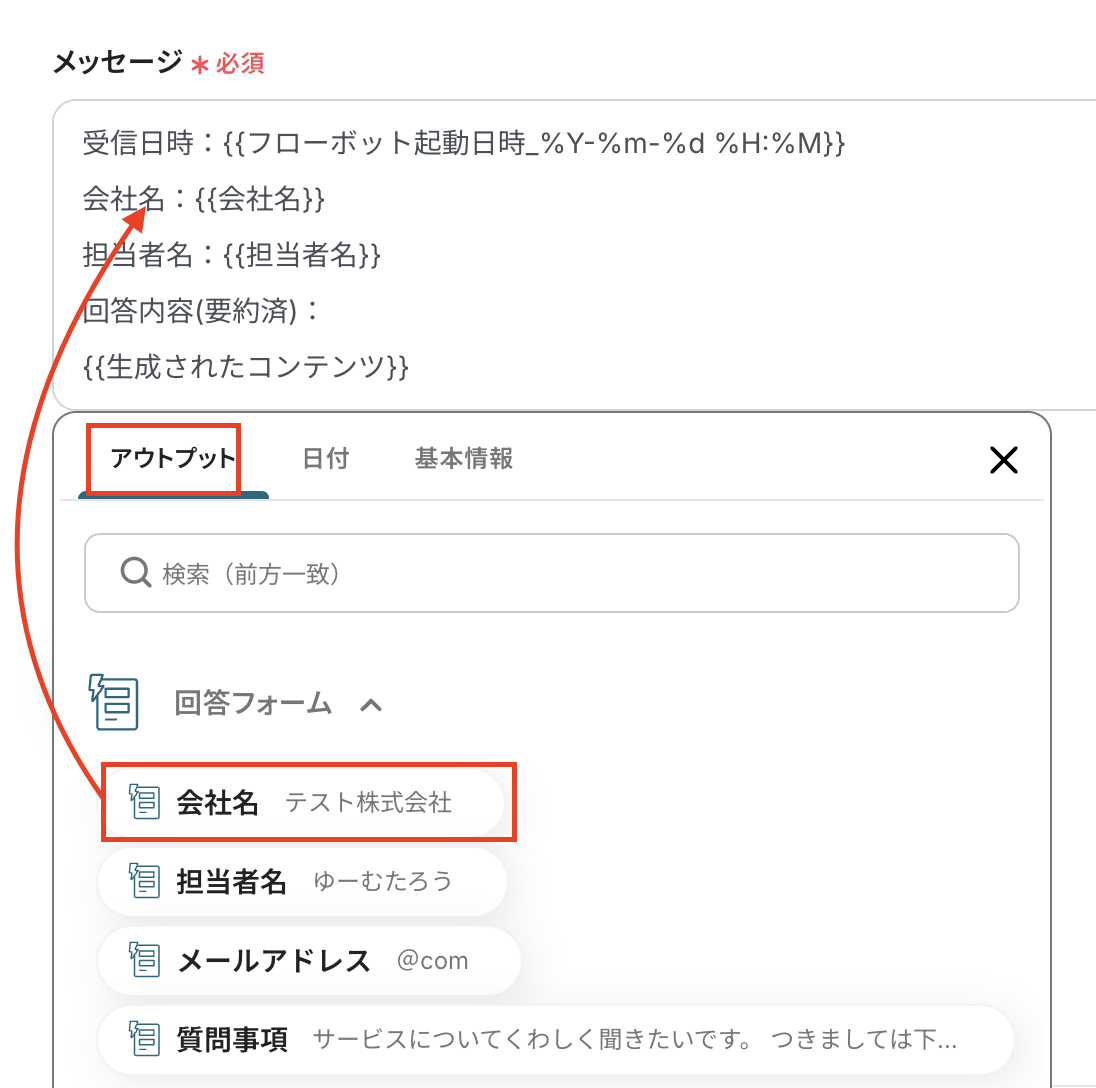 会社名、担当者名はフォームトリガーで取得したアウトプットを選択しましょう。