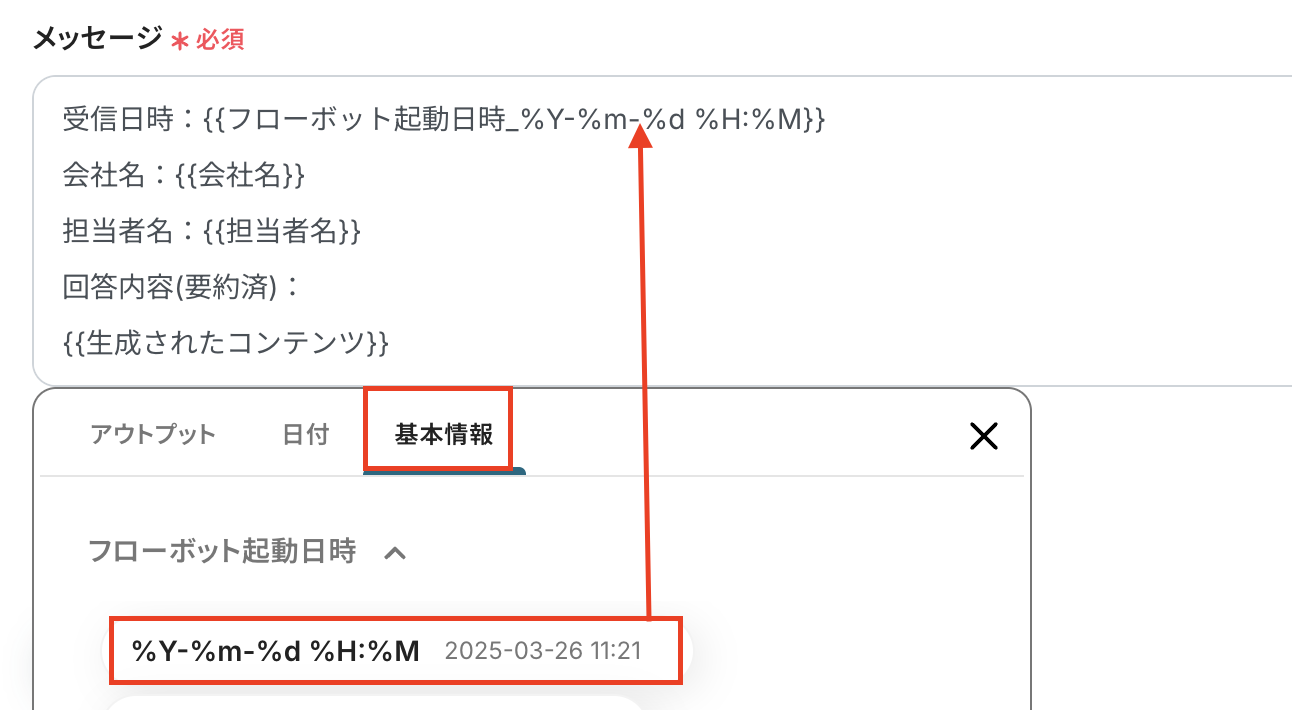 メッセージ内容を作成します。 受信日は、「基本情報」からフローボット起動日を選択します。