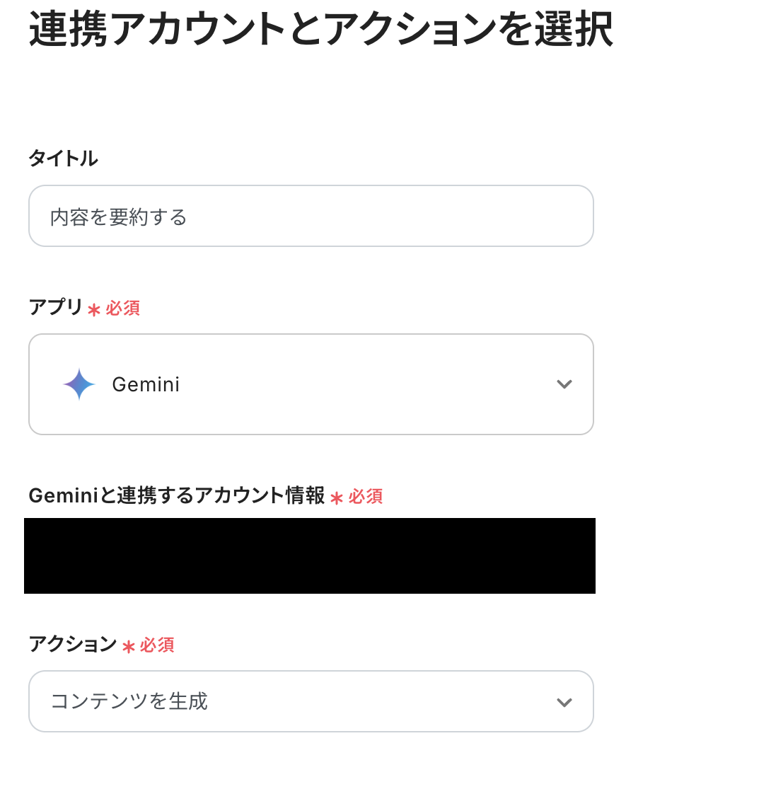 連携アカウントとアクションを選択 タイトルは変更できます。 Geminiと連携するアカウント情報を確認しましょう。 アクションは「コンテンツを生成」が選択されていることを確認し、次へをクリックしてください。