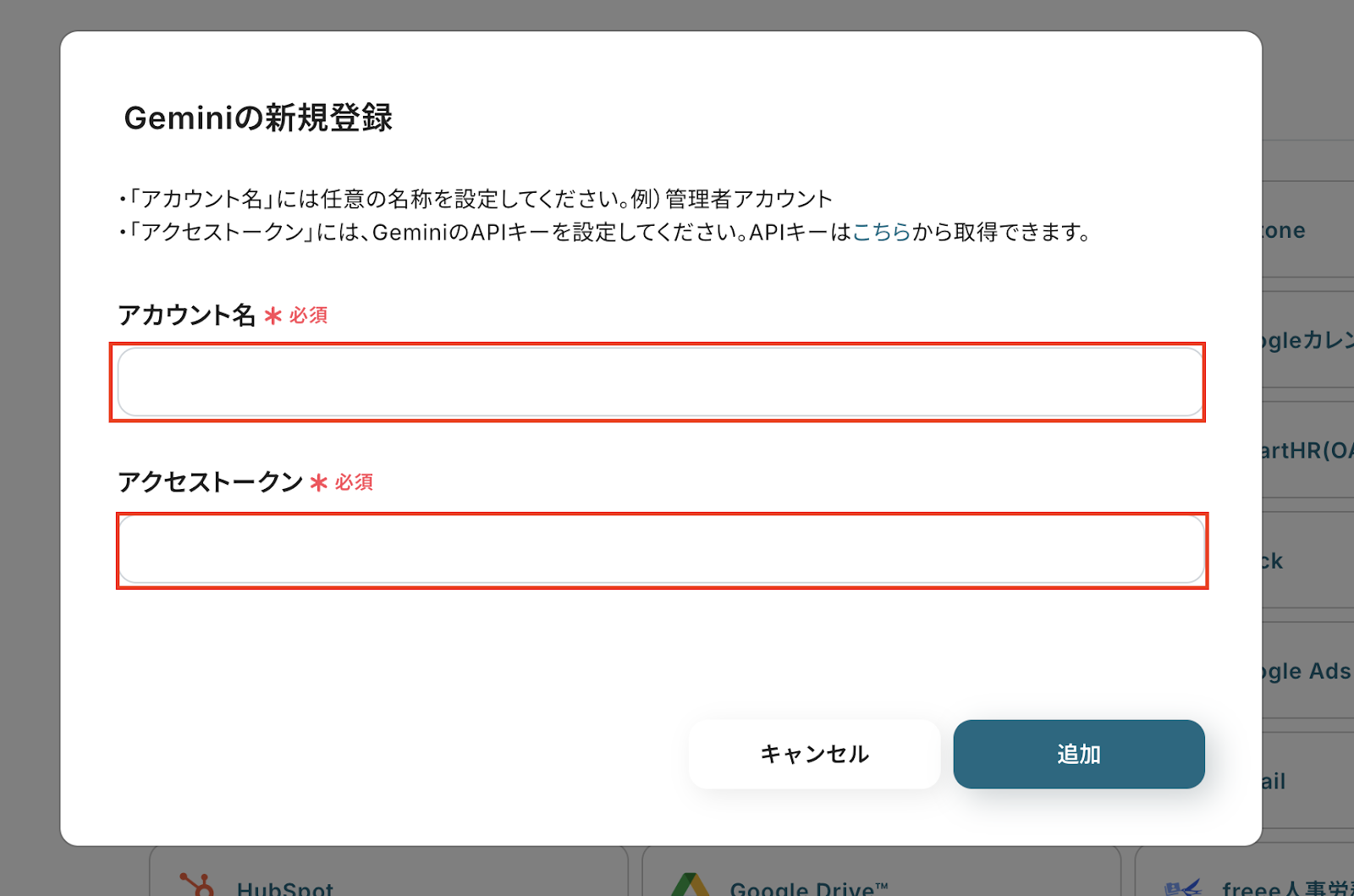 アカウント名は任意の名称を入力してください。 アクセストークンはGeminiのAPIキーをこちら から取得し、入力しましょう。