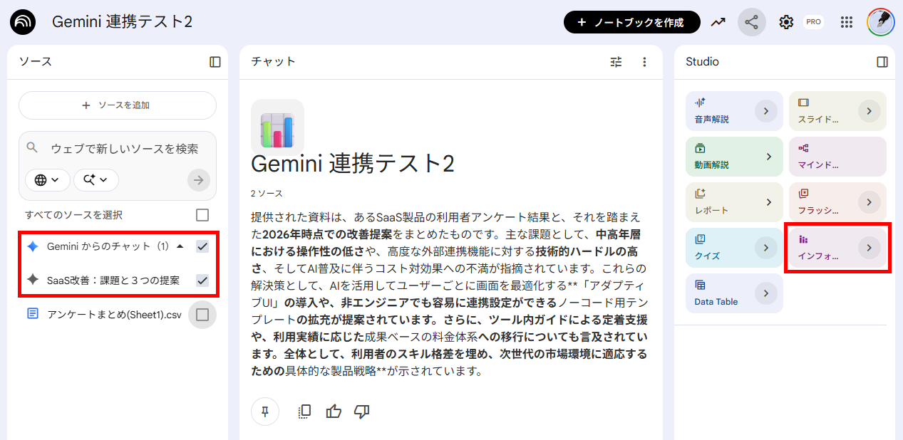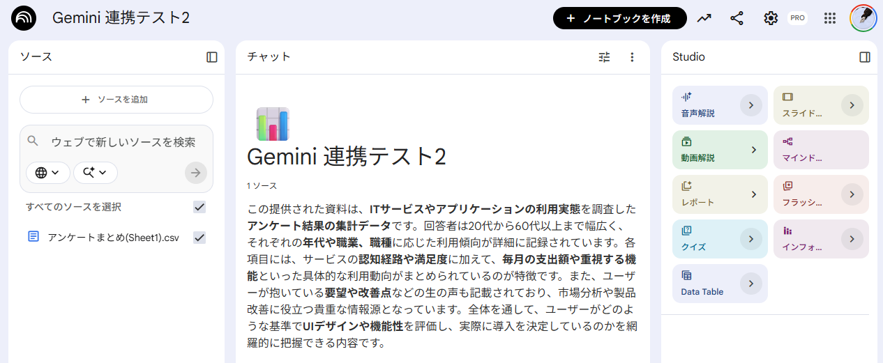 検証2:アンケート結果をもとにした課題と改善案のインフォグラフィック作成 NotebookLM単体でも資料の要約や分析は可能ですが、Geminiと連携させることで「Web情報を反映した提案」が可能になります。今回は、顧客アンケートから現状の課題と改善案を提案し、社内プレゼン用のインフォグラフィックを作成してみます。まず、NotebookLMに顧客アンケートをアップロードしておきます。