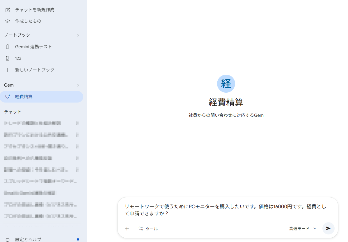 作成したGemを開き、社員からの問い合わせを想定して、以下の検証プロンプトを試してみました。