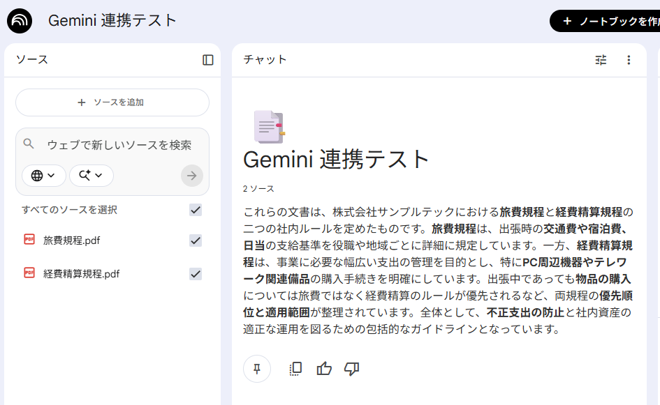 検証結果 NotebookLMとGeminiを連携して自社専用アシスタントを作成してみて、以下のことがわかりました。