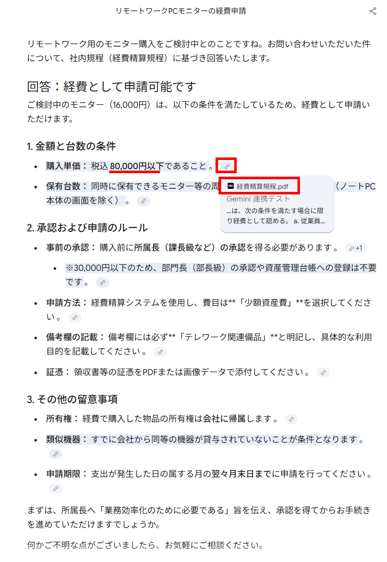 指定した資料のみを正確に参照でき、数値の読み取り精度も高い 回答の根拠となるソースが表示される 状況によってはGemへ直接ファイルを添付する方が効率的 NotebookLMを知識ベースとして連携させることで、添付した社内規程などの指定資料のみに限定して回答を生成できることが確認できました。特に、金額などの細かい数値データも正確に読み取ることができ、ビジネスの実務にも十分耐えうる高い精度を誇ります。 また、生成された回答の該当箇所には根拠となるソースファイルが明記されるため、生成AIの課題であるハルシネーションを防ぎ、スムーズなファクトチェックが可能です。複数のドキュメントを横断的に調査したい場面では非常に強力なツールとなります。