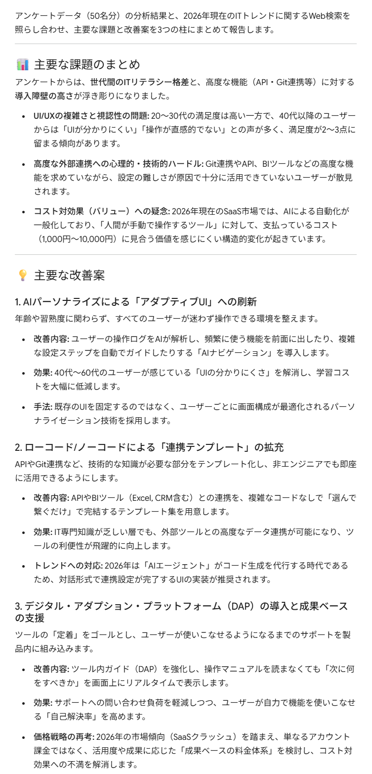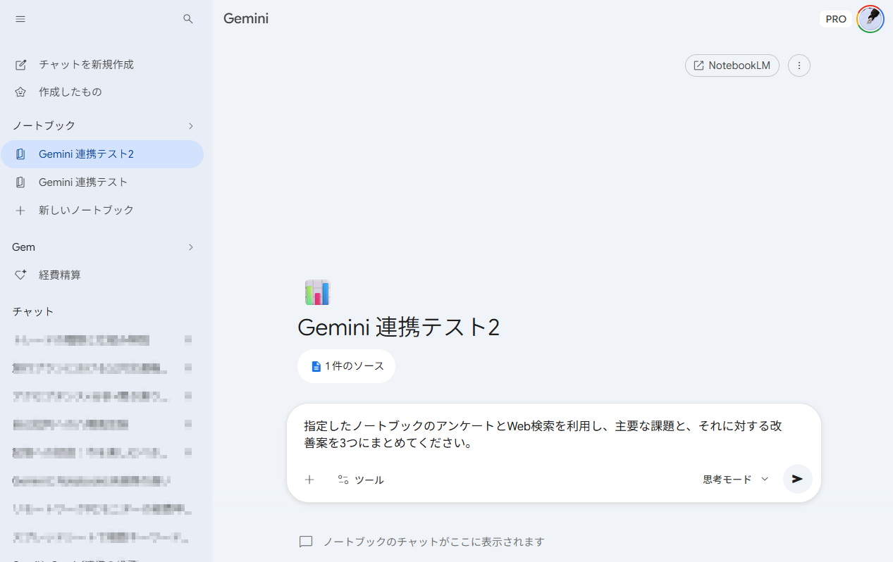 次にGeminiで、上記で作成したノートブックを開き、Web検索を併用して課題と改善案をまとめます。
