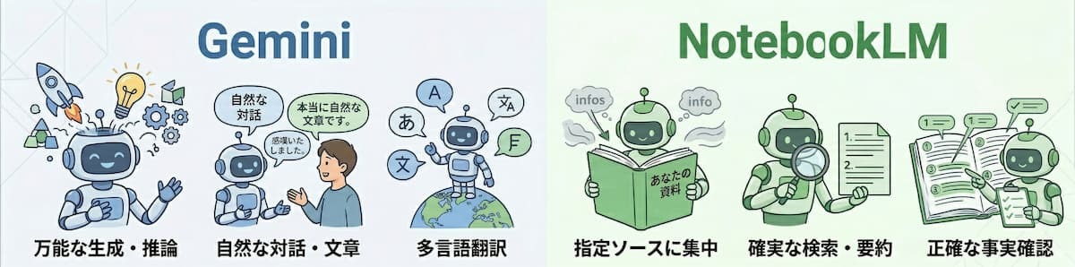 Gemini: Googleが開発した高度な生成AIモデルで、複雑な推論、自然な文章の生成、および多言語間の翻訳などに優れています。ユーザーの意図を汲み取った柔軟な会話対応が可能で、企画書の作成やアイデアのブレインストーミングなど、幅広い用途に向いています。NotebookLM: ユーザーが指定した資料(ソース)のみを学習対象とする特化型のAIツールです。数百件のファイルをアップロードでき、その範囲内でのみ情報検索や要約を行うため、事実関係の確認に優れています。Geminiは「思考・表現力」、NotebookLMは「正確な記憶・検索力」という、それぞれ異なる強みを持つツールとなっています。