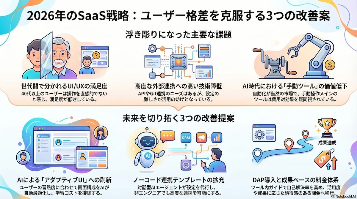 指定したノートブックのアンケートとWeb検索を利用し、主要な課題と、それに対する改善案を3つにまとめてください。