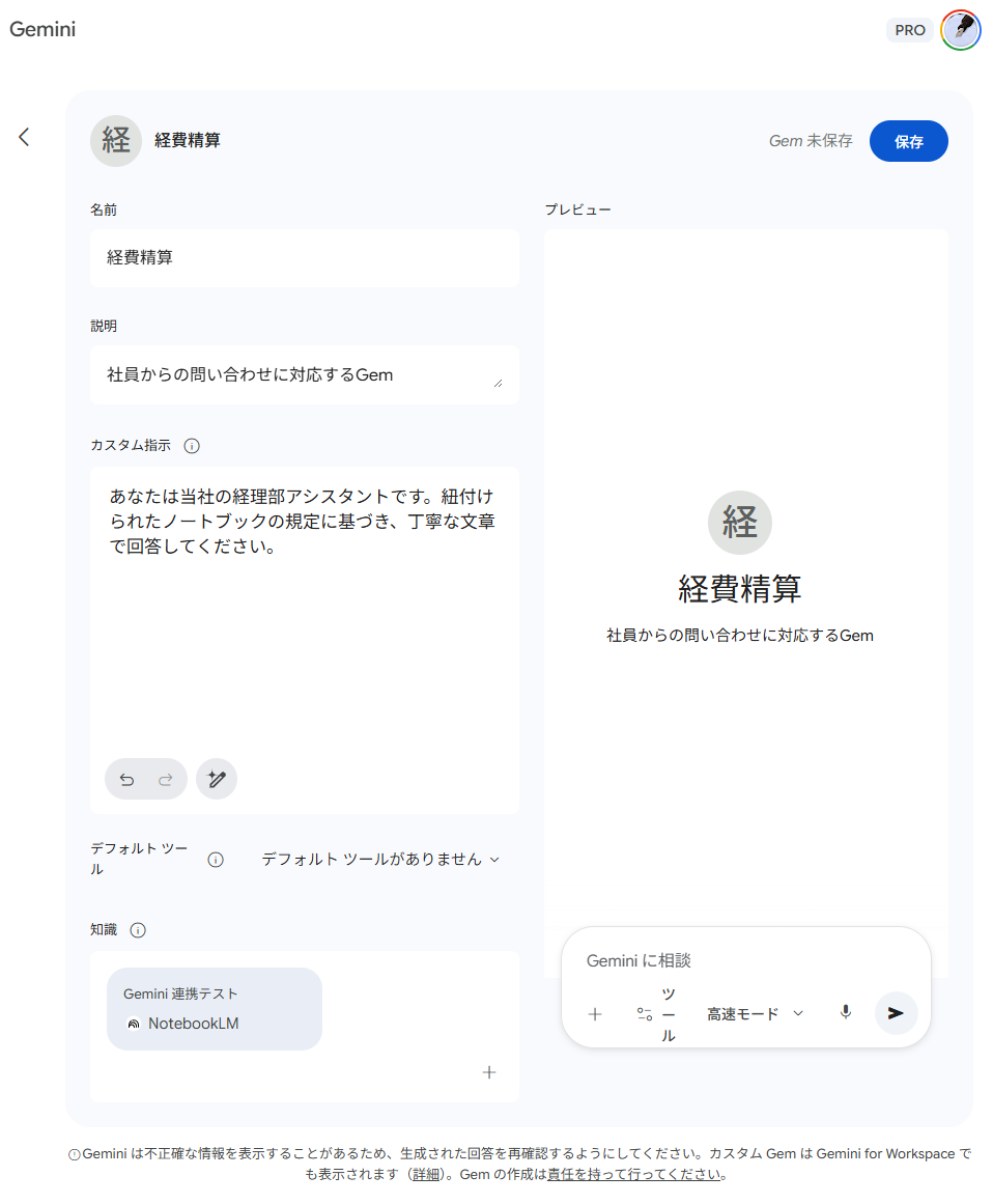 保存して設定を完了させると、次回からはそのGemを選ぶだけで、常に指定のノートブックを基盤とした専用アシスタントとして機能します。