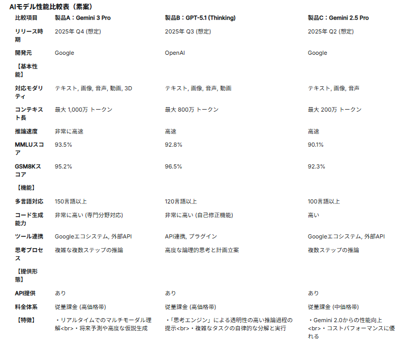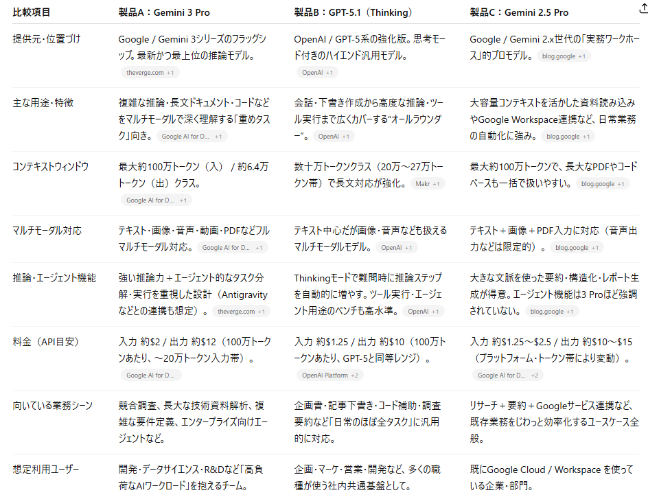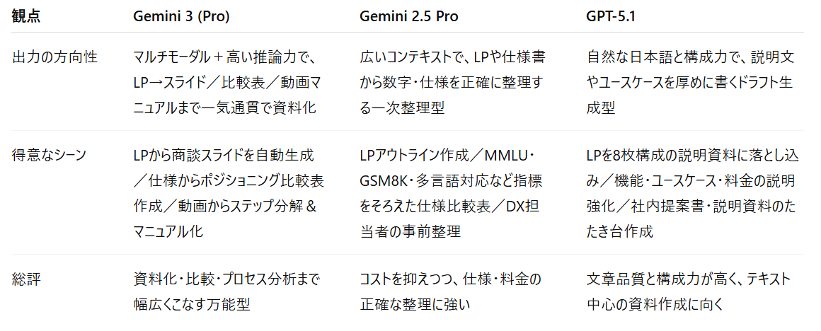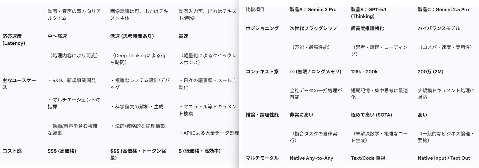 Gemini 3 Pro / GPT-5.1Thinking / Gemini 2.5 Pro の3モデルの仕様を与え、1枚に収まる比較表の素案を自動生成できるかを検証し、比較観点の妥当性、表としての整合性、1枚に収まる構成力を比較します!