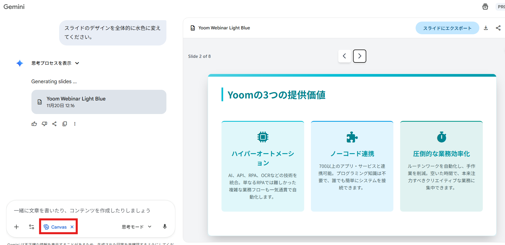 最初からCanvas形式のスライドとして出てくるため、そのままPPTXやGoogleスライドにエクスポートすればレイアウト崩れは最小限でした。
