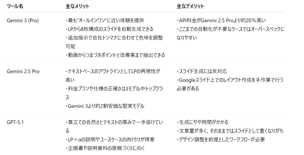 Gemini 2.5 Proはスライド生成こそできないものの、テキストベースのアウトラインとしてはLPの再現性が高く感じました。