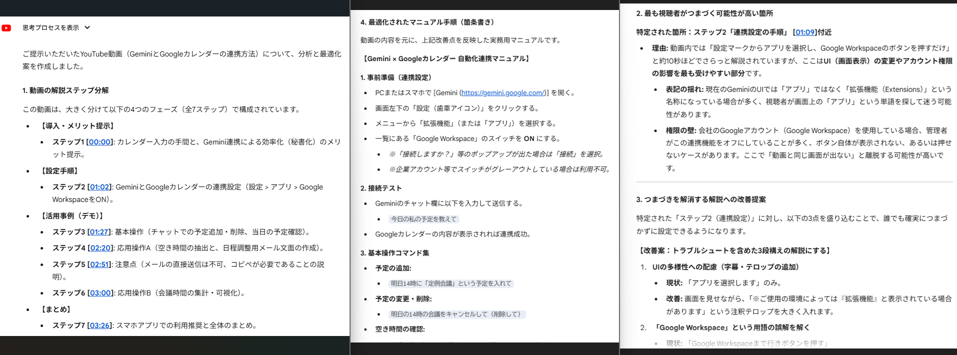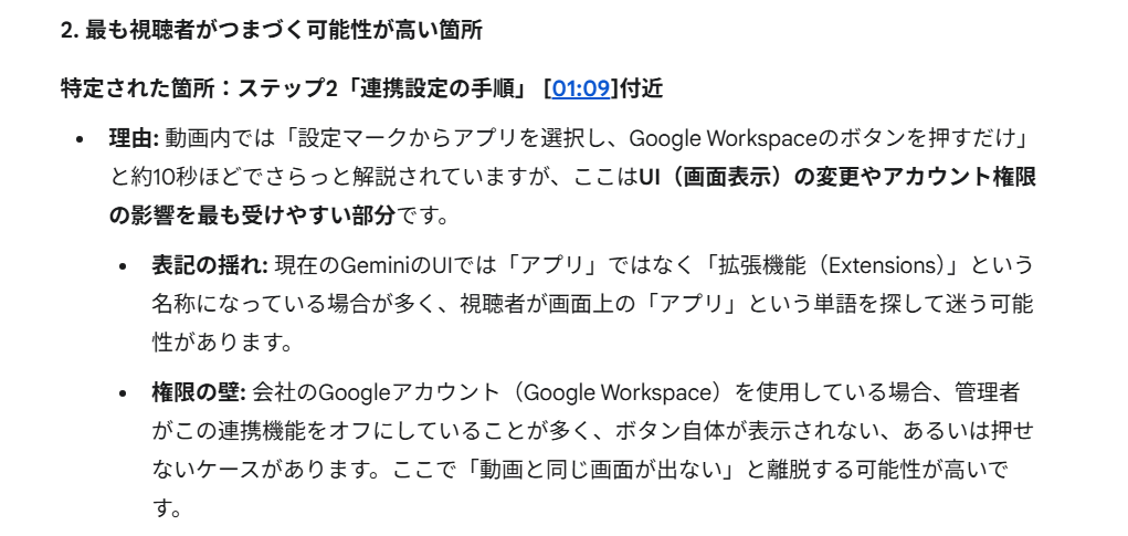 視聴者が迷いやすい箇所として、ステップ2「連携設定の手順」周辺をピンポイントで指定できていました。UI上の表記ゆれ(アプリ/拡張機能)と、Google Workspaceの権限設定による画面差異という、実際に問い合わせが起きやすい原因まで言語化されているのが優れています。
