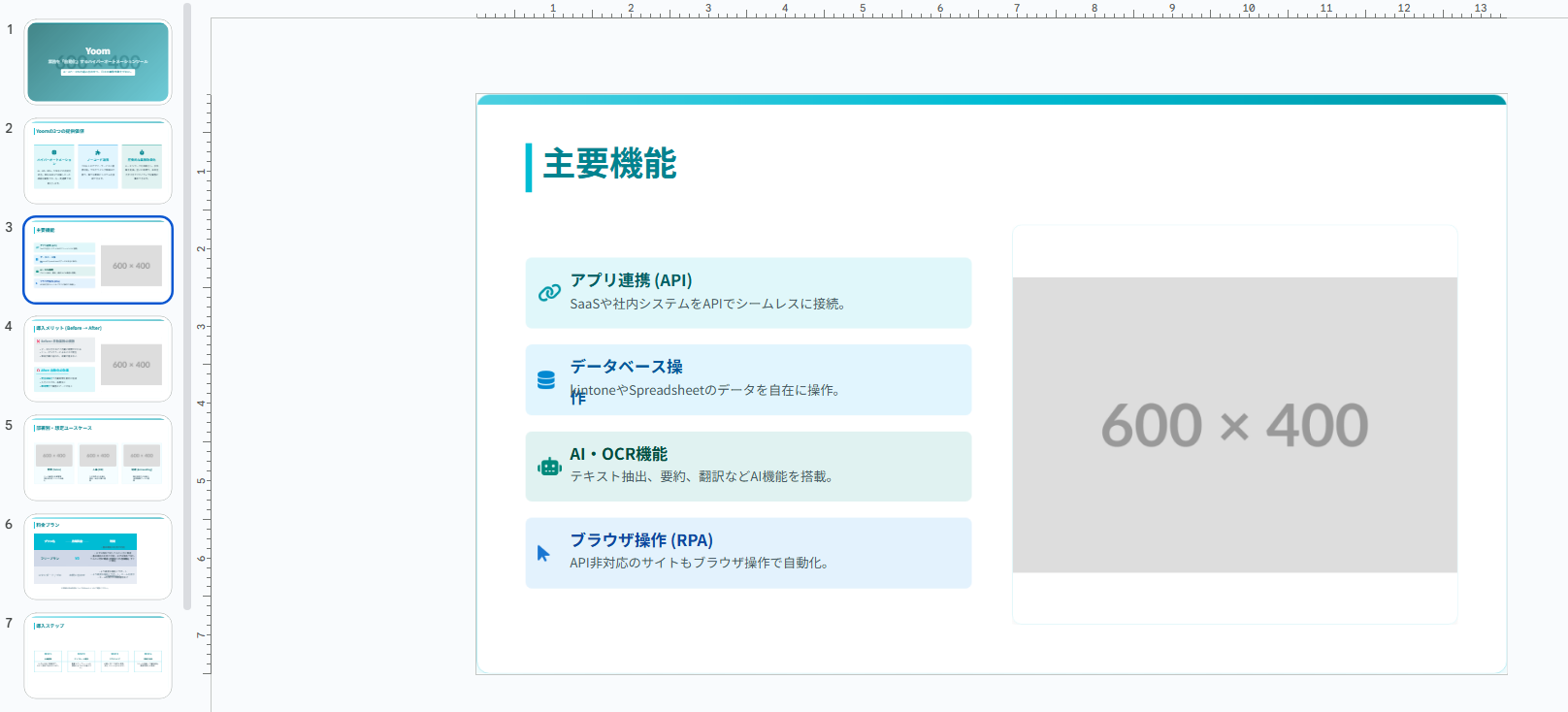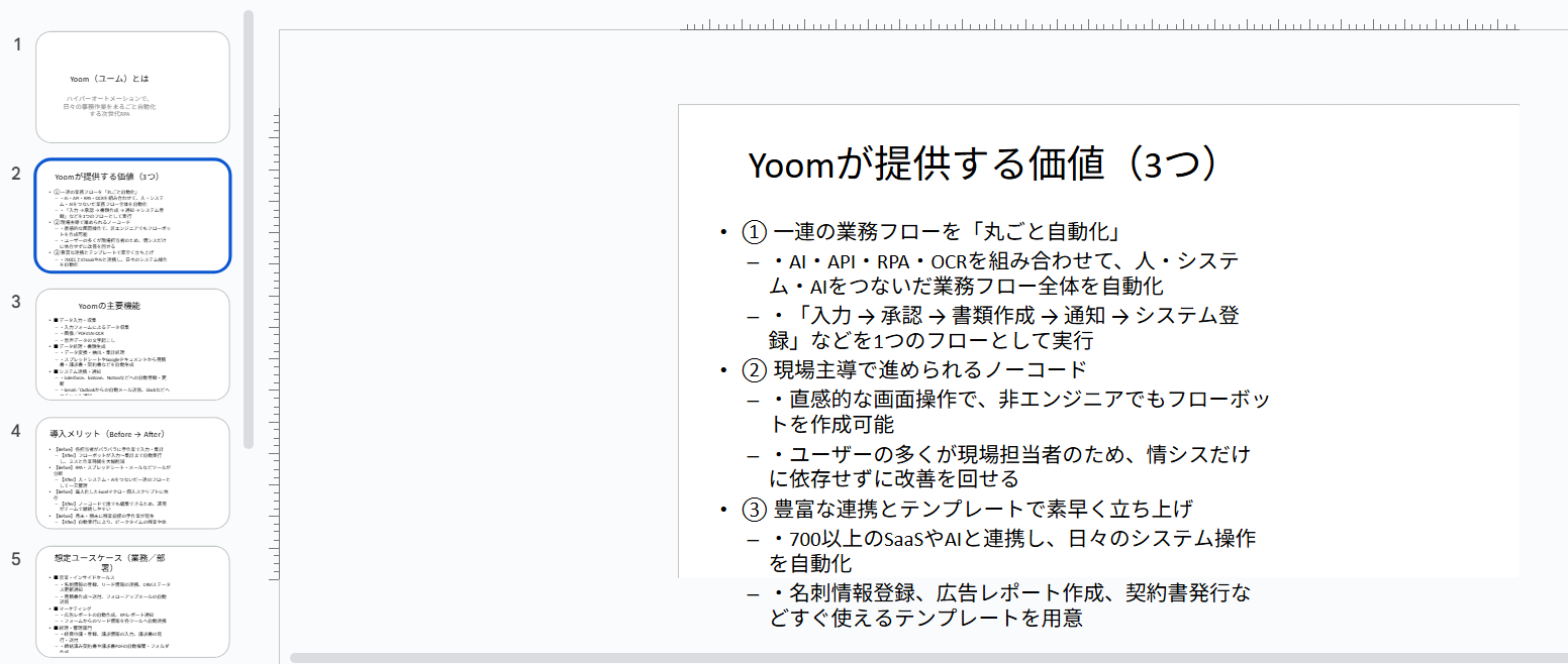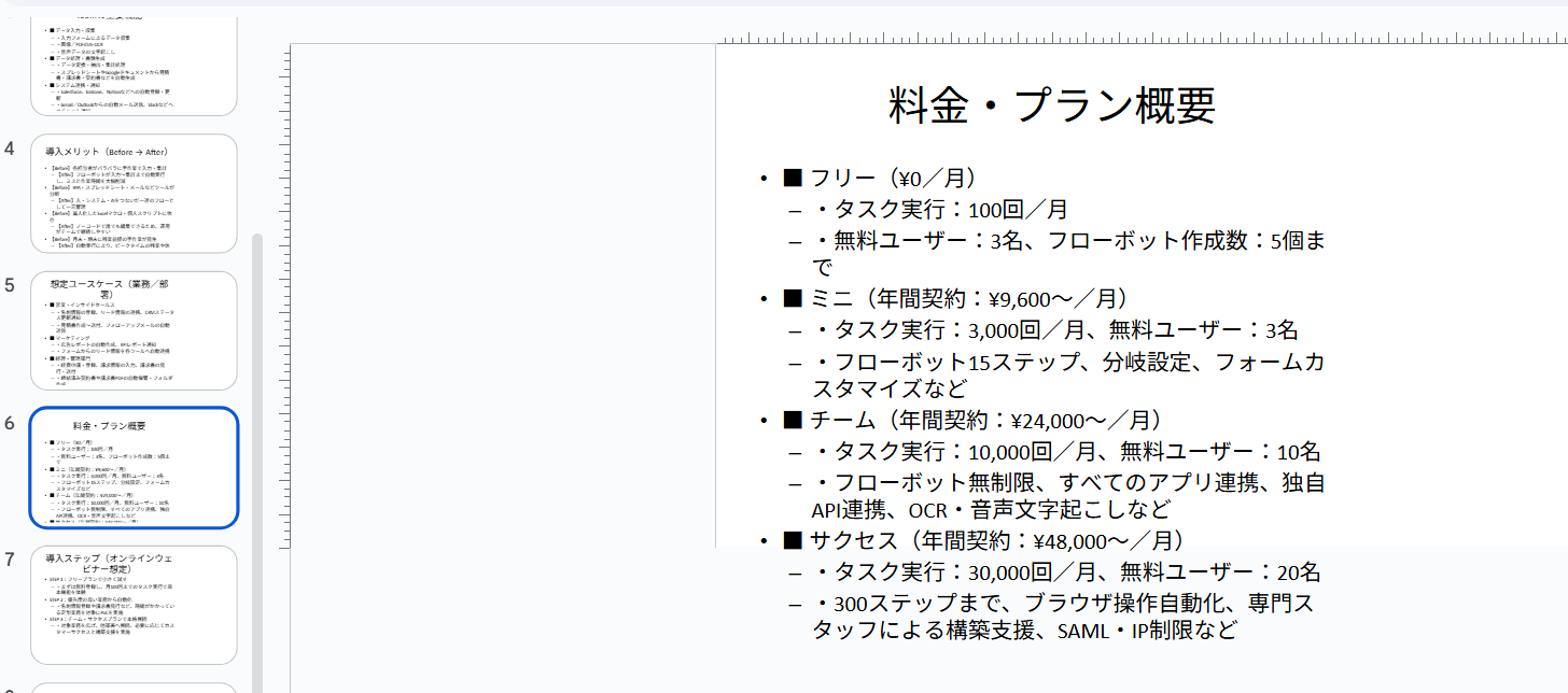 LPのテキストをほぼそのままスライド構成に落としており、事業概要〜提供価値〜料金までのメッセージはかなり忠実に再現できていました。
