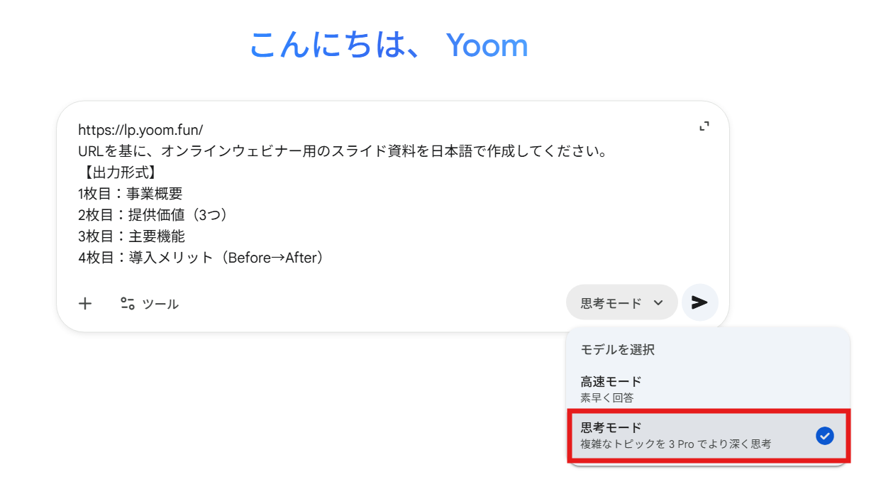 いつものGeminiの画面に入り、思考モードを選択してプロンプトを送信しました。