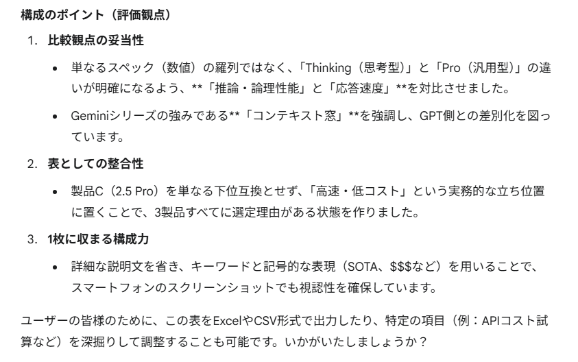 セルごとの文章量もやや多く、一覧表というより読み物に近い印象で、GPT-5.1 Thinkingのような「ひと目で比較できる」感覚は弱めです。