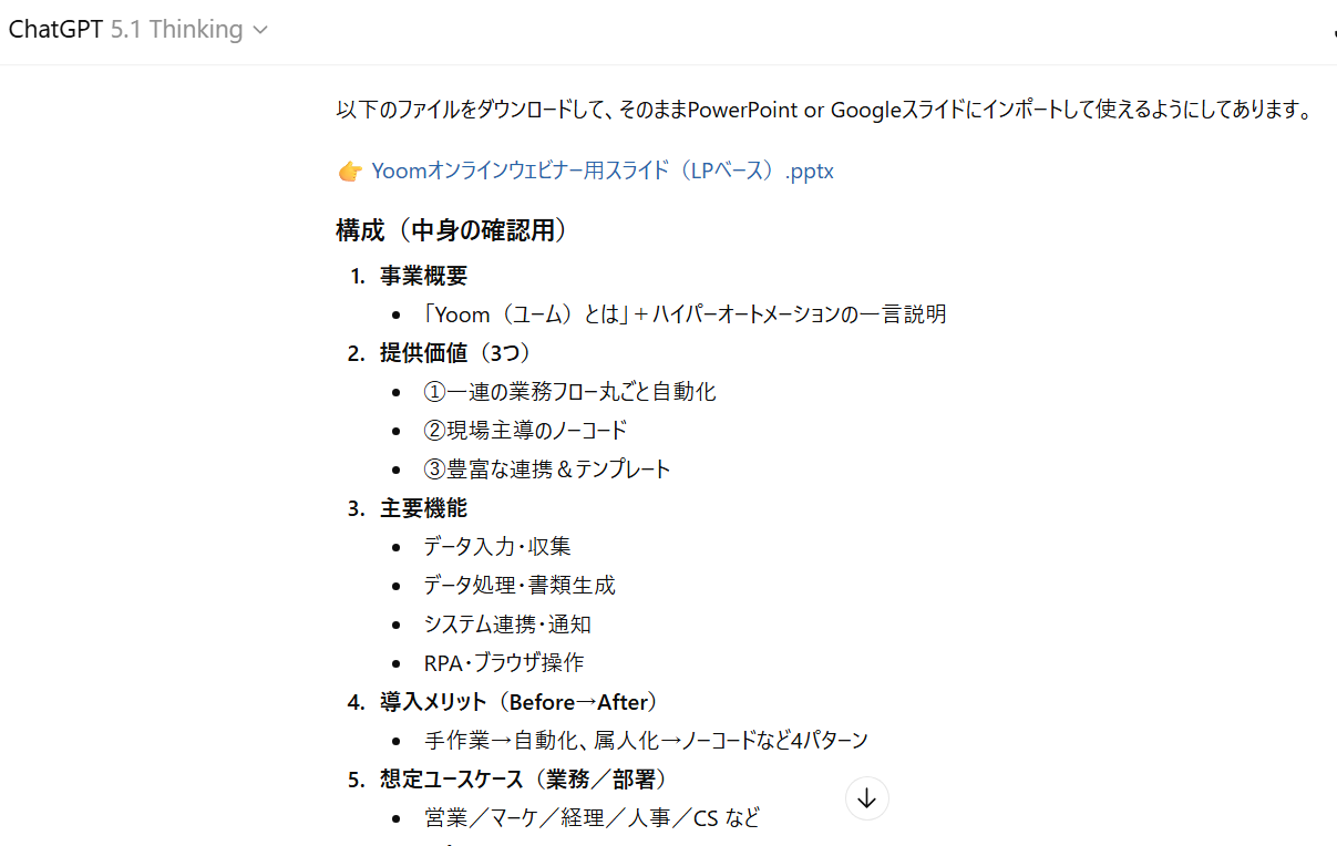 GPT-5.1 Thinkingは生成にやや時間がかかるものの、章立ての自然さとテキストの厚みでは一歩抜けており、LP+αの説明やユースケースの肉付けが得意です。