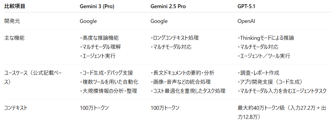 今回の3つの利用シーンを通じて、Gemini 3 (Pro)・Gemini 2.5 Pro・GPT-5.1の3ツールは、はっきり異なる役割を持つことが分かりました。
