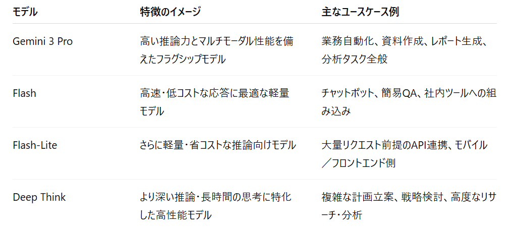 また、現在Gemini3には以下のようなタイプがあります。