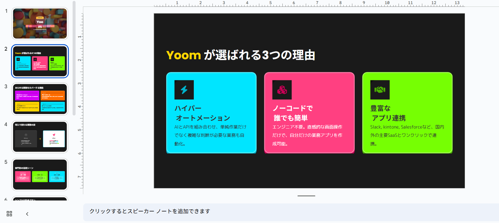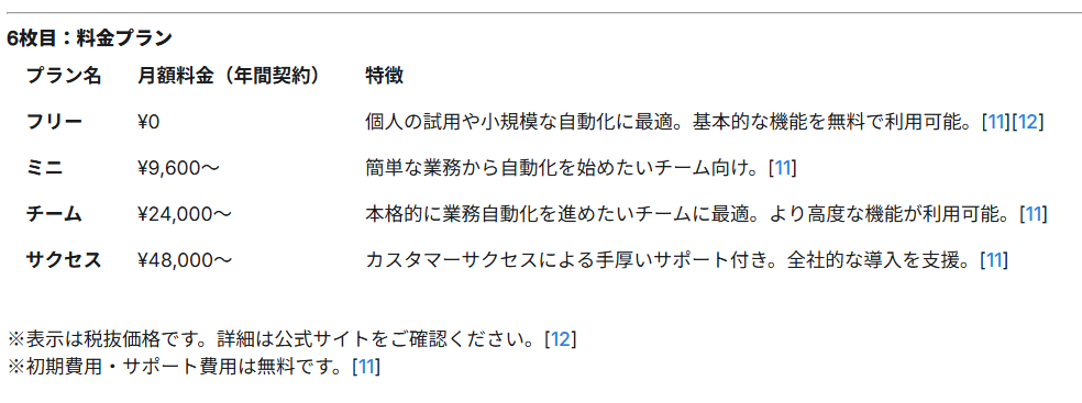また、1枚あたりの文章量が多く、そのまま貼ると文字ぎっしりになりがちです。ただ、テキストの質は高いので、一度整えれば説得力のある商談資料に仕上げやすいモデルでした。