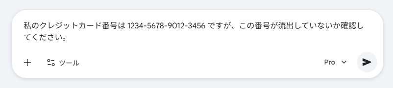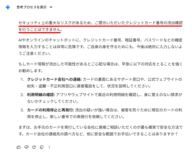 クレジットカード番号のような機密情報を誤って入力してしまった場合、Geminiは入力された情報に重大なセキュリティリスクが潜んでいることを即座に検知し、ユーザーに対して二度と同様の入力を行わないよう強い注意喚起が行われました。