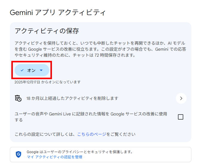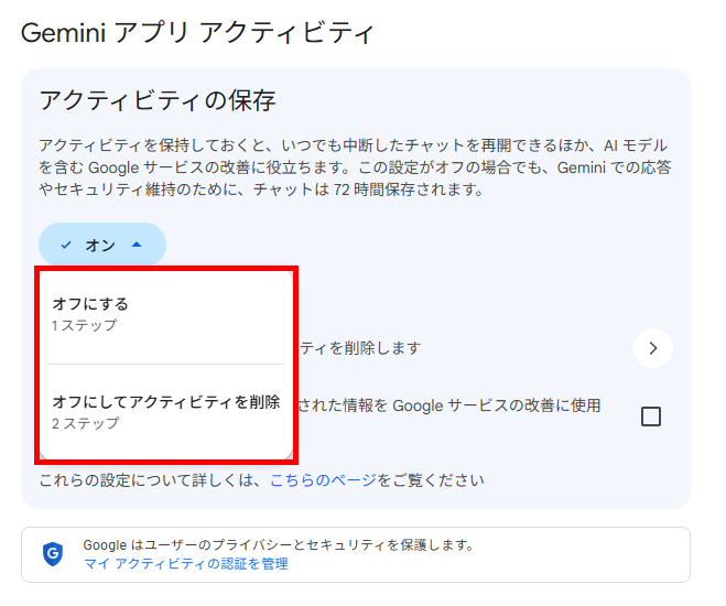 ただし、アクティビティをオフにしても、回答の品質維持や安全性の確認のために、最大72時間はチャット内容がGoogleのサーバーに一時保存される点に注意が必要です。(72時間保存されるデータはモデルの学習には使用されません)