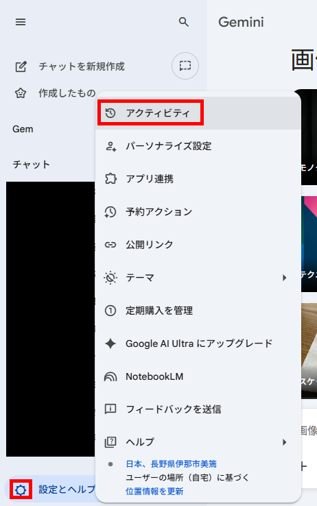 個人アカウントで学習を回避するためには、「Gemini アプリ アクティビティ」の設定を変更します。