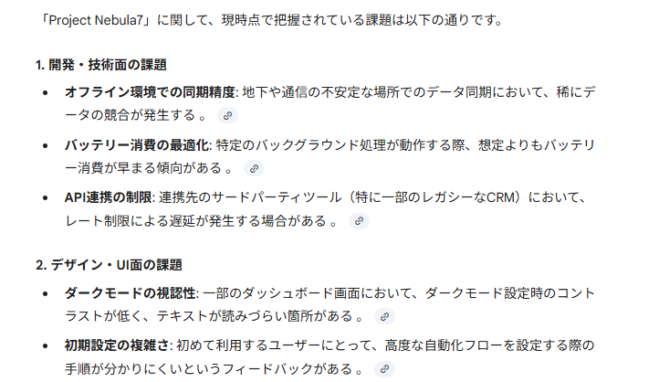 「さきほど共有した『Project Nebula7』について、現時点で把握している課題を箇条書きで整理してもらえますか?」