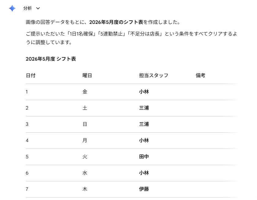 📈まとめ 今回は、Geminiを活用したシフト作成の自動化について、具体的な手順やメリットを詳しく解説しました。希望の収集から条件のすり合わせ、そして表の作成に至るまで、AIの力を借りることで業務時間は大幅に短縮 されます。 最初はプロンプトの微調整などに少し戸惑うかもしれませんが、慣れてしまえば店長や管理職の強力なアシスタントとして大活躍してくれるはずです。 ぜひ本記事のステップと注意点を参考に、ご自身の職場でGeminiを使ったシフト作成にチャレンジしてみてください。 浮いた時間をスタッフとのコミュニケーションや店舗のサービス向上に充てることで、より良い職場環境の構築につながっていくはずです。