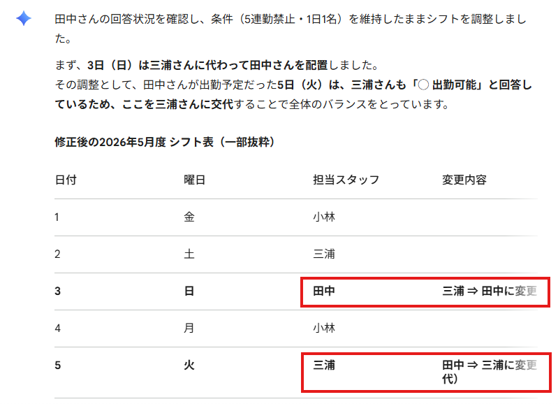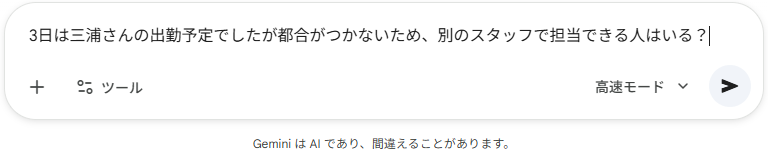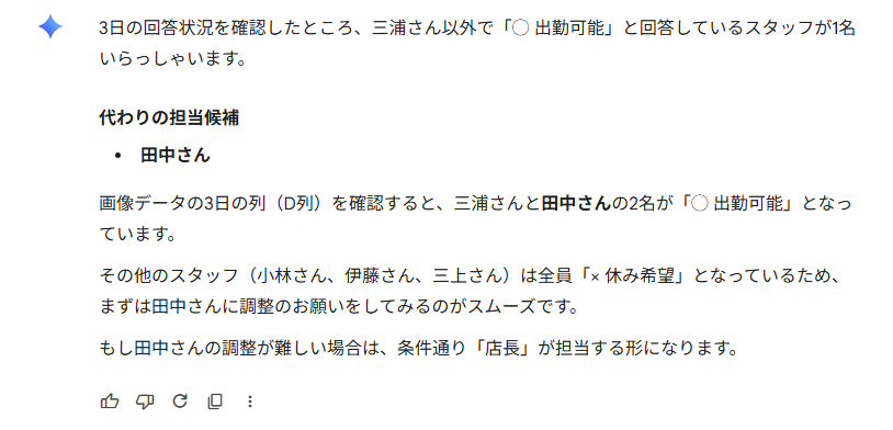 ステップ3:対話形式で条件の微調整・欠員対応を行う AIが一発で完璧なシフトを出してくれることもありますが、実際の店舗運営では「この日はどうしても人が足りない」といった微調整 が必ず発生します。 Geminiの便利なところは、出てきた結果に対して対話形式でそのまま修正を加えられる点にあります。たとえば、出来上がったシフト表を見たスタッフより特定の日にちにやっぱり出勤できない旨の連絡がきたとします。 その場合、Geminiに対して「3日は三浦さんの出勤予定でしたが都合がつかないため、別のスタッフで担当できる人はいる?」 とそのままチャットで伝えます。