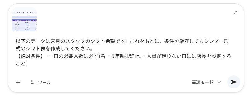 再びGeminiの画面を開き、以下のような詳細なプロンプトを作成してデータを貼り付けます。 「以下のデータは来月のスタッフのシフト希望です。これをもとに、条件を厳守してカレンダー形式のシフト表を作成してください。【絶対条件】 ・1日の必要人数は必ず1名 ・5連勤は禁止。・人員が足りない日には店長を設定すること」