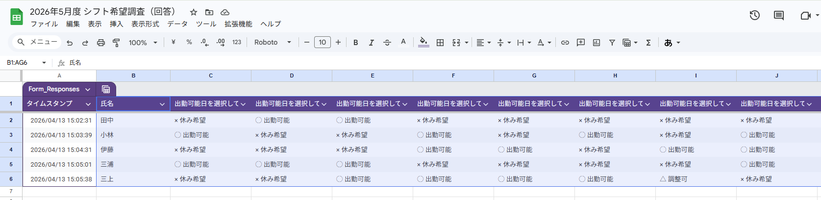 ステップ2:スプレッドシートのデータを基にシフトを一発生成 フォームを使ってスタッフの希望休が集まったら、スプレッドシートにて結果の表示を行うことができます。 次はこのデータを使って、実際にGeminiにシフト表を組んでもらいましょう。