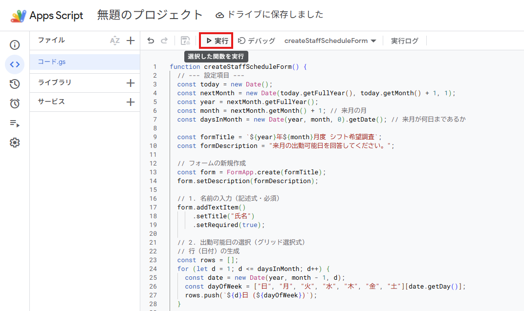 開いた画面に元々書かれている文字をすべて消し、先ほどGeminiからコピーしたコードをそのまま貼り付けて「保存」と「実行」ボタンを押します。※注記: Google Apps Scriptには、1回の実行時間が「6分まで」という制限があります。 項目数が極端に多い場合などはタイムアウトでエラーになる可能性があるため、まずは少人数のデータから試してみるのが安心です。