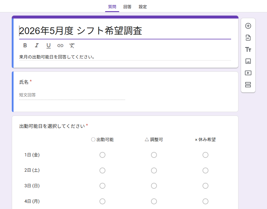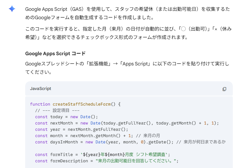 ステップ1:シフト希望収集フォームをGASで自動生成 まずは、スタッフからシフト希望を集めるための「Googleフォーム」を作成します。 一から手作業で作ることもできますが、今回はGeminiにGoogle Apps Script(GAS)というプログラムのコードを書かせ、フォームを生成する方法 を試してみました。