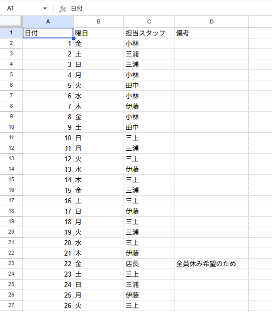 スタッフの希望休がまとまったスプレッドシートのデータ部分(名前と希望日が書かれている範囲)をコピーします。